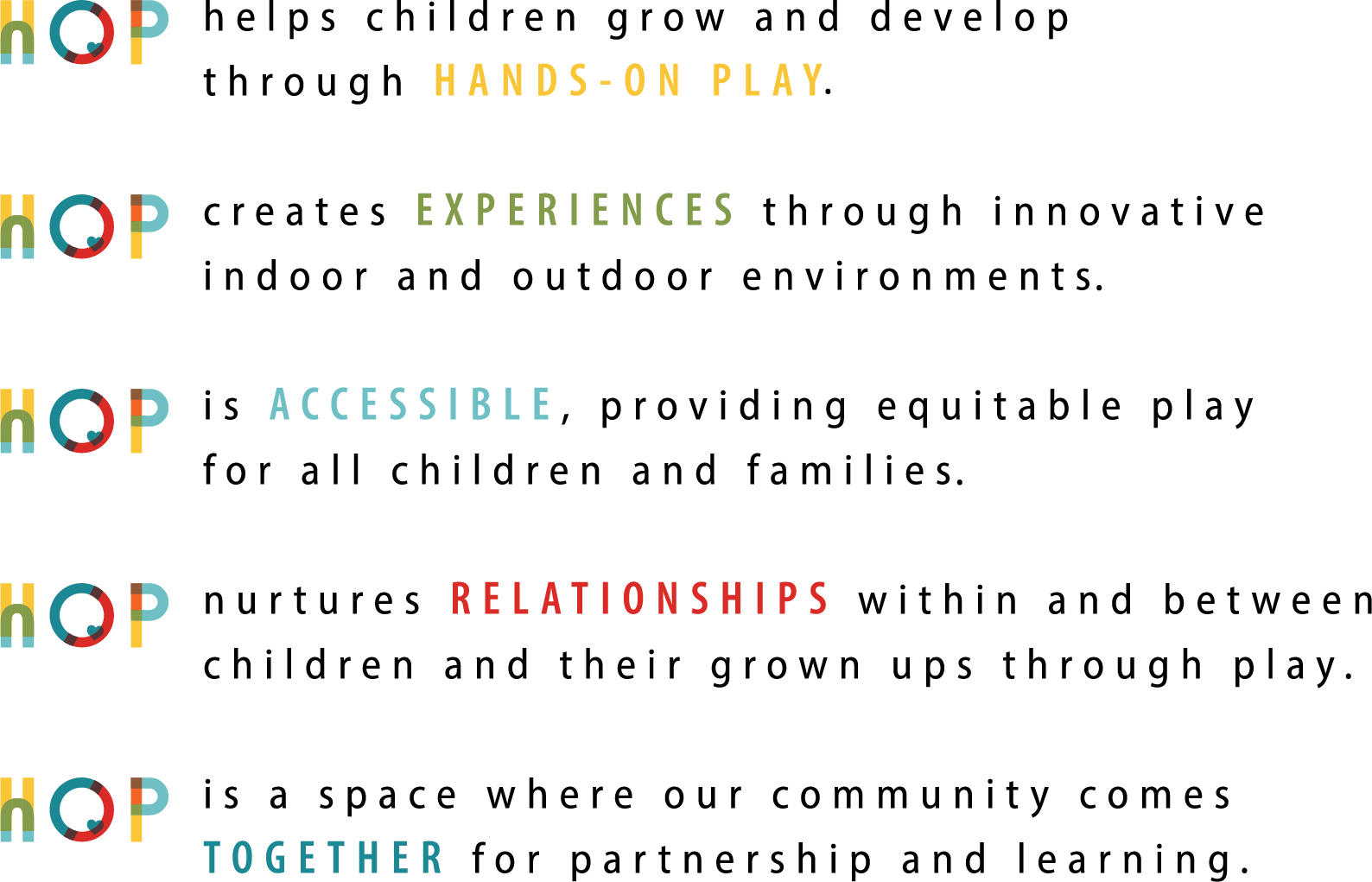 To provide an accessible, interactive space where children, youth, and families build belonging and community through play.
